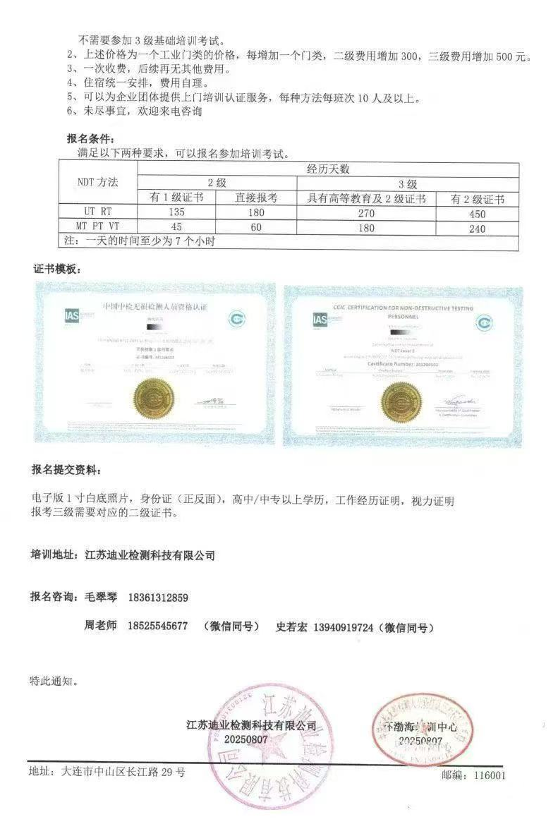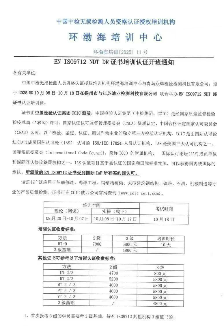 中国中检无损检测人员资格认证授权培训机构环渤海培训中心与青岛众辉检验检测科技有限公司,定于2025年10月08日-10月18日在扬州市与江苏迪业检测科技有限公司联合举办EN IS09712 NDT DR证书认证培训班。